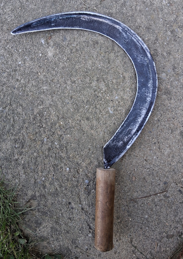 Jó-jó, azért a rozsdás szög meg a facsavar az határeset. De vegyünk például egy sarlópengét! Az eredeti állapotot nem fotóztam le, ám szemtanúim bármikor bizonyíthatják: elejétől a végéig színrozsda volt szegény már évek óta. Lecsiszoltam a rozsdát, a fémcsiszoló koronggal már pici élt is adtam bele, de azért hagyománytiszteletből kaszakővel is fentem, bekentem használt étolajjal (bármilyen olaj megfelel ilyenkor: gépolaj vagy használt motorolaj is, csak ugye utóbbi igen büdös – annyi a lényeg, hogy valami viszkózus anyag födje a rozsdátlanított felületet, a további oxidációt megakadályozandó), találtam hozzá egy nyelet, azt megfúrtam, a pengét belevertem, s most olyan jó fogása van, és úgy vág, mintha ma vettem volna a gazdaboltban. És miért találtam hozzá nyelet? Hát mert tudtam, hogy apukámnál, a régi disznóólnak a kispadlásán hol kell keresnem a nyélnek valót, elvégre folyamatosan matatok, s így mindenről tudom, hogy hol van!