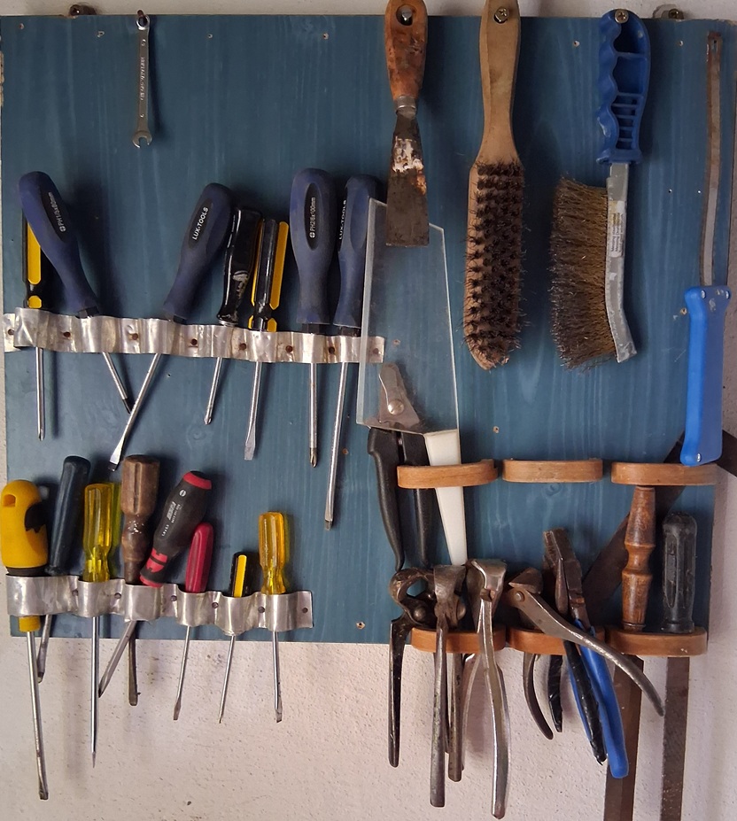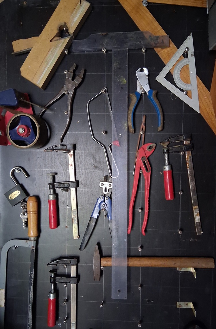 Szerszámaink közt egyébként épp úgy akad saját pénzből vásárolt, mint hagyatékból örökölt, ajándékba kapott vagy talált. Nem vagyunk márkahűek, se minőségfetisiszták, általában addig használunk valamit, amíg totálisan szét nem esik. És még a szétesett akármiket is sokszor fölhasználjuk holmi művészkedésre. A hulladéknak minősülő alumíniumlemezből vágott s szintén hulladéknak minősülő laminált pozdorjára (egykor konyhaszekrény-garnitúra ajtaja volt, minek fogantyúiból szintén szerszámtartó elemek lettek) szögelt tartókák a saját találmányaim, de direkt nem szabadalmaztattam, hogy a közjót szolgáljam zseniális ötletemmel, mi így legálisan lopható. Persze csak megfelelő munkavédelmi kesztyűben.