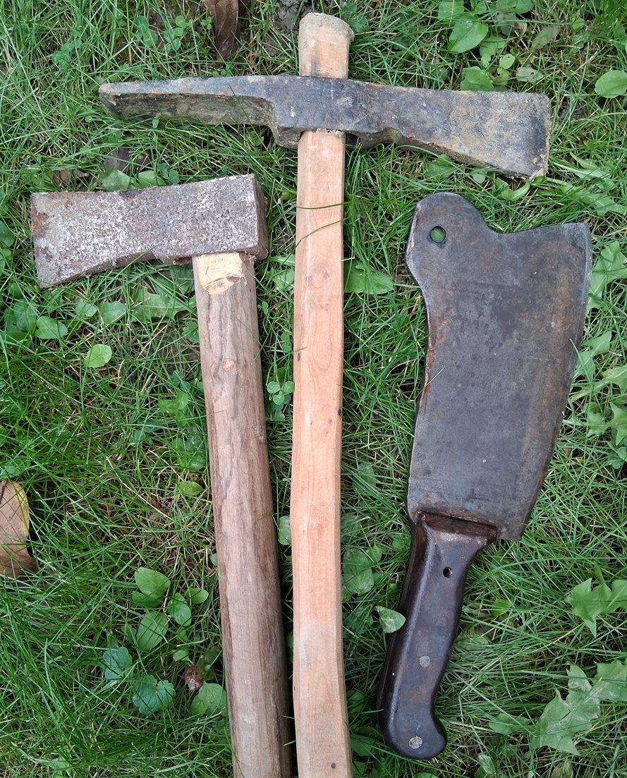 A kisbalta nyelezése tévedés (még nem döntöttem el, hogy másik nyelet kap, vagy ezt a böszme ásónyéldarabkát faragom-csiszolom addig, amíg jó nem lesz – a faanyag amúgy jó volna), illetve a baltafejjel is bőven akad még dolgom. Ezek a régi, muzeális, kovácsolt baltafejek egyébként örök életűek. Jó karbantartás mellett még az ükunokám is hasogathat vele gyújtóst. Nem tudok elképzelni olyan élethelyzetet, ami egy ilyen vasdarabot tönkrevág. Talán ha gyakran állítom bele ellenséges harcosok pajzsába/páncéljába/koponyájába, akkor el tudom pusztítani, de ily eseménysorozatra manapság kevés esélyt látok. A bányászcsákány (kötött vagy köves talajban gödörásásnál, gyökerek, kövek eltávolításához igen jól jön!) nyelét viszont abszolút elrontottam, túl vézna, ezt majd a nulláról kell újrakezdenem. A húsvágó bárd hagyatékból került hozzánk, anyukám nem igényelte konyhai munkára, így kerti szerszám lesz ebből is, hasonlóan fogom fölújítani, mint a fent mutatott sarlót. Szintén kiváló eszköz gyökerek elvágására, holt fatönkök eltávolításában sokat segít az ilyen nagy súlytóerővel bíró szerszám.