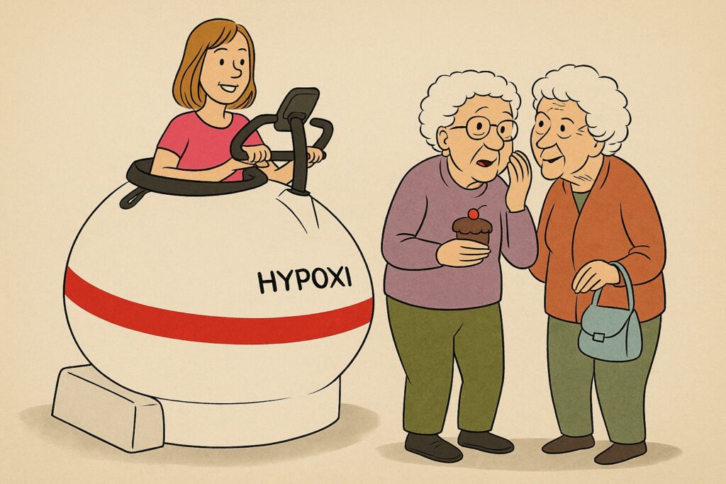 Az örömöm azonban nem tartott sokáig. Amikor beültettek az úgynevezett hypoxi tréner gépbe és beállították az erősségi fokozatot, azonnal lebuktam. Kiderült, hogy a leggyengébb fokozaton is alig bírok tekerni. Bár nem láttam, de gondolom, a nyugdíjas nénik biztosan csoportokban röhögtek rajtam, amint a tüdőmet kiköpni készültem röpke tíz perc elteltével.