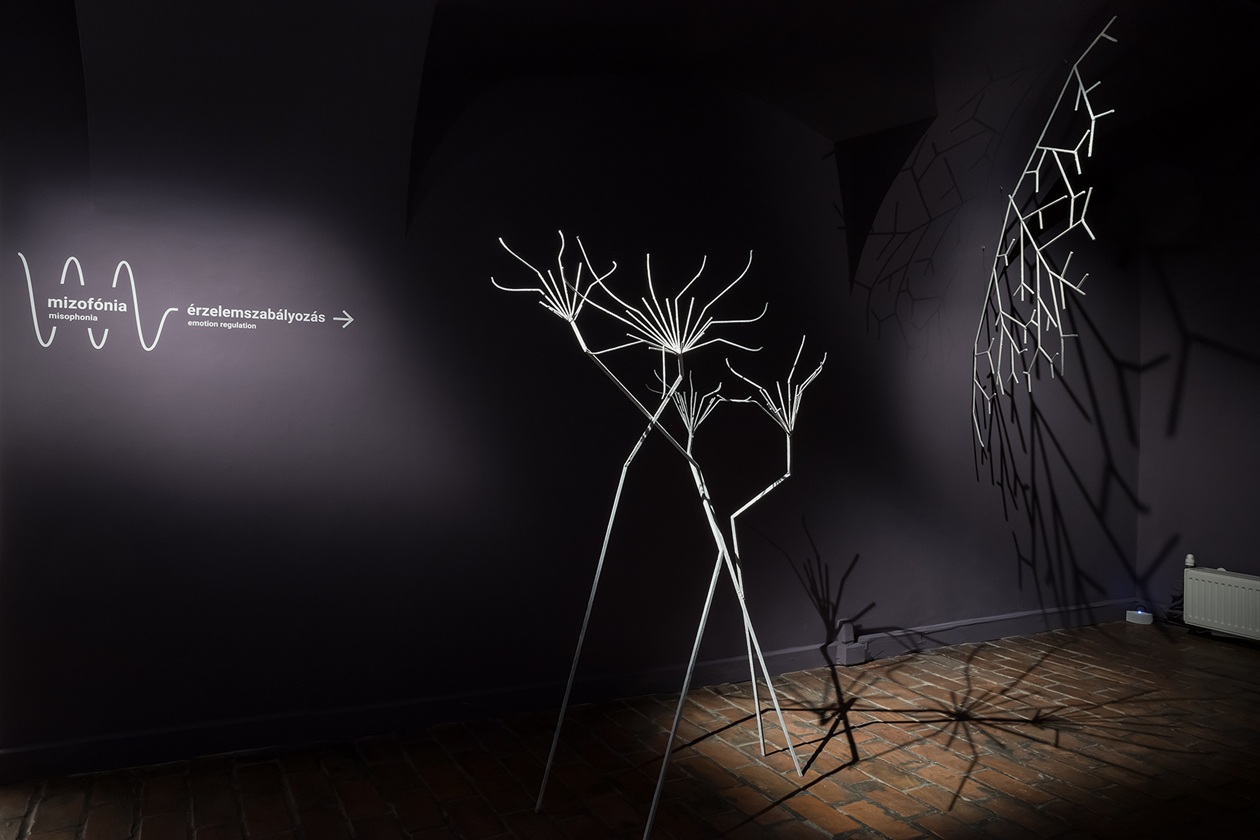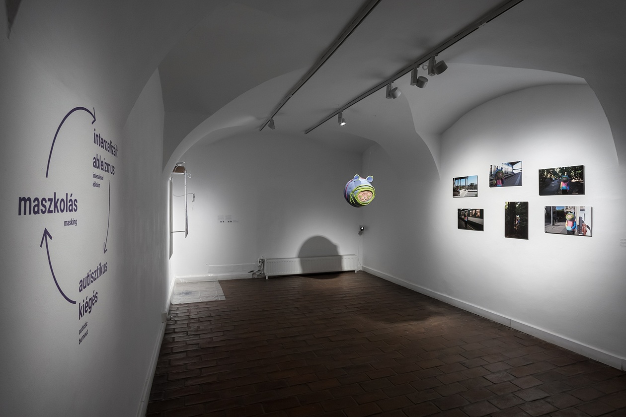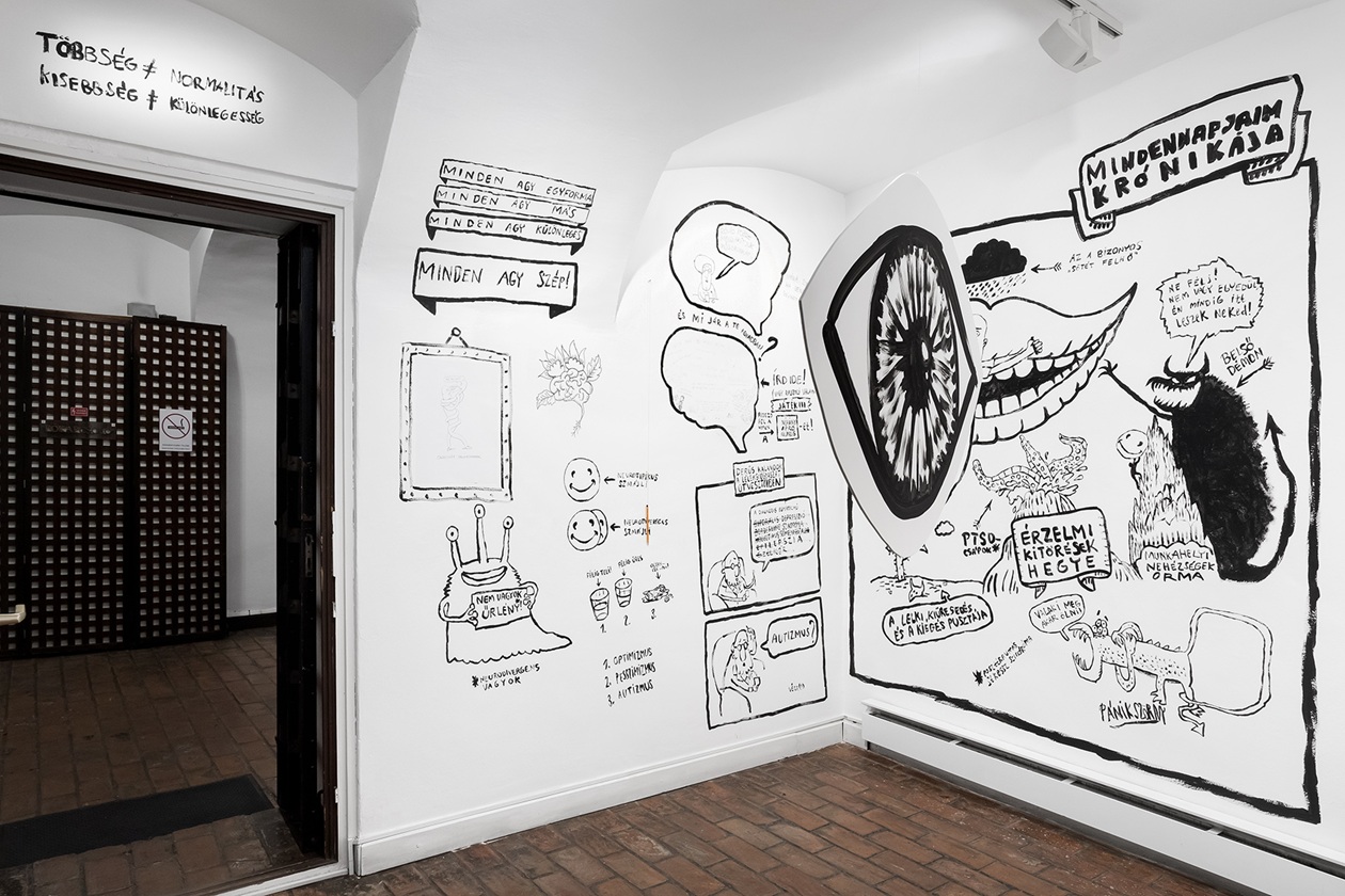A kiállított munkák megértése, az általuk adott nézőpont beépítése saját működésünkbe közel sem mindig egyszerű feladat. P. Szathmáry István egész termet beterítő grafikái (Minden agy szép) első pillantásra vidám figurák és jelenetek tömkelege, de ott van minden megszólalásában a frusztráltság, ami a felnőttkori diagnózis kézhezvétele előtt és után is részét képezi a neurodivergens személyeknek. Humoros, de kíméletlenül őszinte, szó szerint feketén-fehéren tárja elénk vívódásokkal teli világát. Gyarmati Zsuzsi egésztermes társasjátéka (Életke) is csak első pillantásra mókás. Valójában egy élet-halál harc bontakozik ki a szemünk láttára. A művész saját élményei nyomán vezeti át a nézőt a diagnózis felállításán át a gyászfeldolgozásáig. A „játék” azonban kilép saját életének határai közül, hiszen a falon sorban tűnnek fel az autista közösség kihívásait bemutató információs mezők is. A kiállítás alkotói rendkívüli bátorsággal dolgoztak saját élményeikkel, ezzel pedig a közbeszéd témájává emelték azt, amit az érintettek egy jelentős része a maszkolással pontosan elfedni igyekszik. Németh Dóra műcsoportja (Nem ér a nevem) egy kedves kis figura álarca segítségével mutatja be a maszkolás hétköznapi helyzeteit, amelyet a neurodivergens emberek létbiztonsági okokból vállalnak, de el is szenvednek. A térben szinte lebegő nemezelt maszkot körbejárva feltárul a bűbájos kis maszkban megbúvó sebezhető és elszigetelt „én”, aki idegrendszerének hálózatában próbál eligazodni. Az idegrendszeri sajátosságok ugyanis fontos tényezői a neurodivergens személyek megértésének: olyan egyéni jellemzők, amelyek a neurotipikus szemlélő számára első pillantásra furcsák lehetnek, mégis komplex és „mást” is bevonó alkotások jöhetnek létre a speciális gondolkodásmód folyományaként, mint Rubóczki Benedek interaktív installációja (Cím nélkül) és festménye. Az installáció szenzorai a nézőt figyelik, letapogatják mozgását és reakcióit, akárcsak az erre fogékony személy idegrendszere. Ez az érzékeny idegrendszer mizofónia esetében bizony kifejezetten heves válaszokat adhat az őt körülvevő zajokra. Ebbe a szindrómába és egy komplex érzelmi- és figyelemszabályozási folyamatba, a különböző érzelemszabályozási technikákba vezeti be a nézőt érzékletes csillogó szobraival Dóra Emese (Világok között). A barlangot, zárt világot idéző térben felsejlő formák vonzóak, ugyanakkor pontosan azt a lélekállapotot írja le, amely a neurodivergens személyt jellemzi. A szenzorossággal dolgozik Velegi Csaba is (Somatic Loop), aki hétköznapi hivatását, a svédmasszázst hívja be egy pillanatonként újjászülető zenei performansz létrehozására. Az emberi testen mozgó kezek hanggá változnak, és az így létrejött zene közvetíti a művész világát a néző felé.