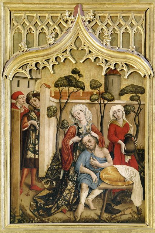 A falamon egy régi naptár lóg, időtlenül. Jókora naptár, szeretem a képeit nézegetni. Közel húsz éve kaptam ajándékba, azóta is őrzöm, megbecsülöm. Persze, hogy a képek miatt. A kassai dóm, a Szent Erzsébet-főszékesegyház főoltárának táblaképei sorakoznak benne, a Szent Erzsébet-legendaciklus tizenkét jelenete. Október lapján Erzsébet a kórház udvarán ülő pokolvaras ember haját nyírja. Az ápolás, a nyomorúságos testhez való lehajlás Szent Erzsébet legendájának karitatív motívumai közé tartozik – a földi terhek enyhítése, az elesettek iránti irgalom, a test rongálódásának alázatos elfogadása még fénylőbbé teszi a szolgálatát. Mozdulata természetes és egyszerű, szelíd, mégis határozott. Talán azt gondolja éppen: „Valakinek ezt is meg kell tennie”. Fölöttük nem a földi égbolt dereng, hanem Isten aranyszínű mennyboltozata. A koldus leple azonban kék – a transzcendencia színe. Mintha a festő azt akarta volna sugallni: az isteni jelenlét ott lakozik a sebzett, megrongálódott test mélyén is.